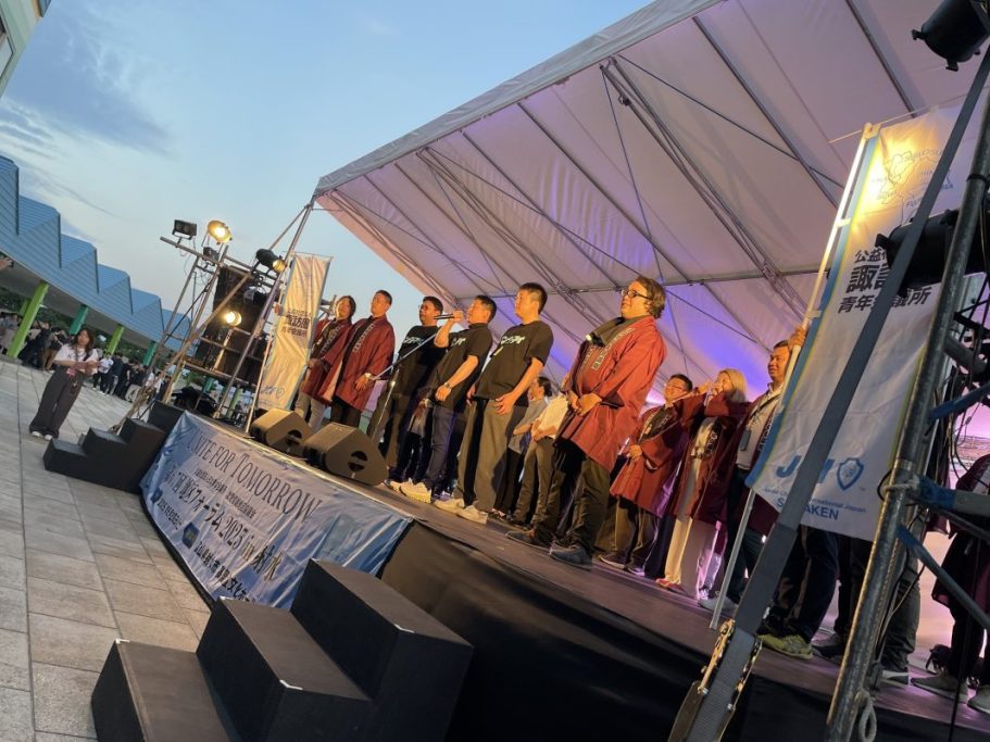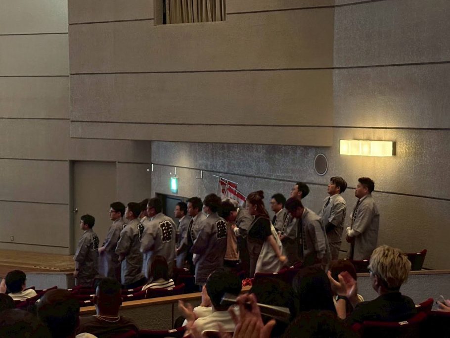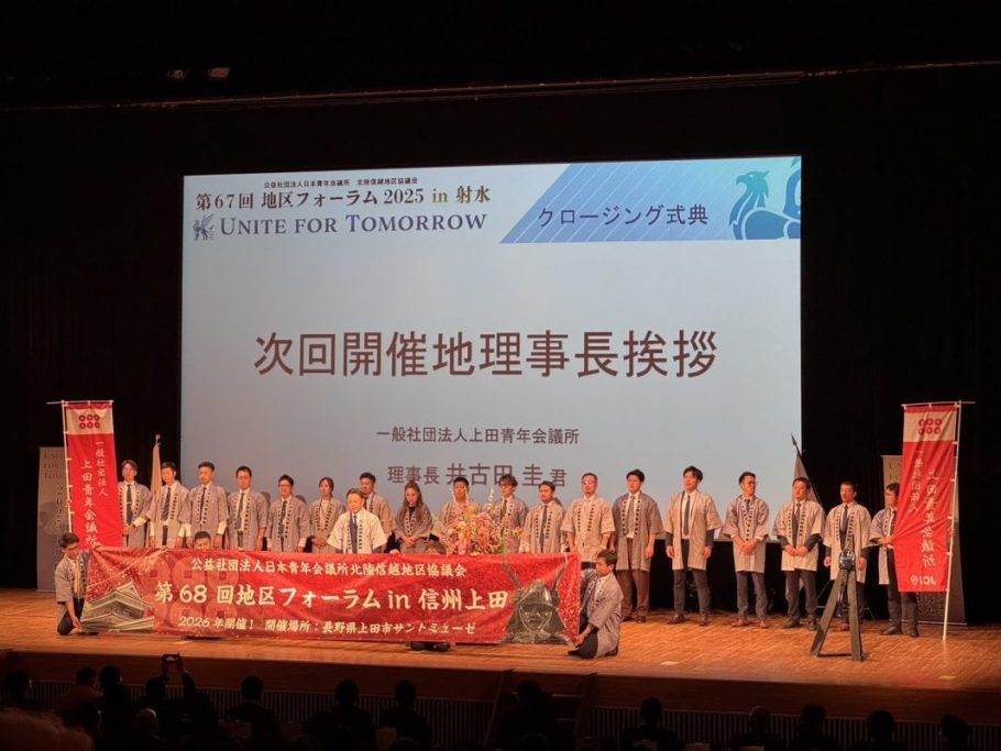 クロージングでは来年の2026年度地区フォーラム開催地が上田に決定と紹介され、井古田圭理事長をはじめ上田青年会議所のメンバーがステージに立ちアピールを行いました。